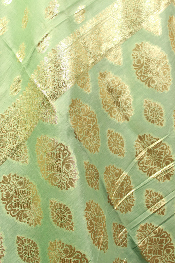 Benira Sage Green Butter Silk with All-over Champagne Booti(Double Blouse Piece)
