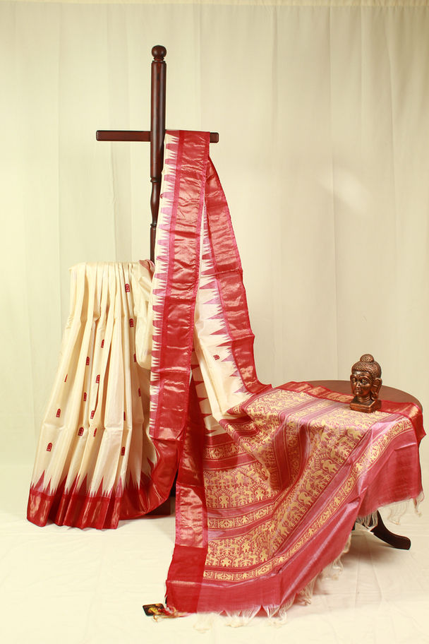 Ivalin Maroon Temple Work on White Beige Pure Kosa Silk Saree