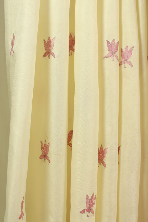 The saree is crafted in a soft cream base, beautifully paired with pastel pink embroidery.