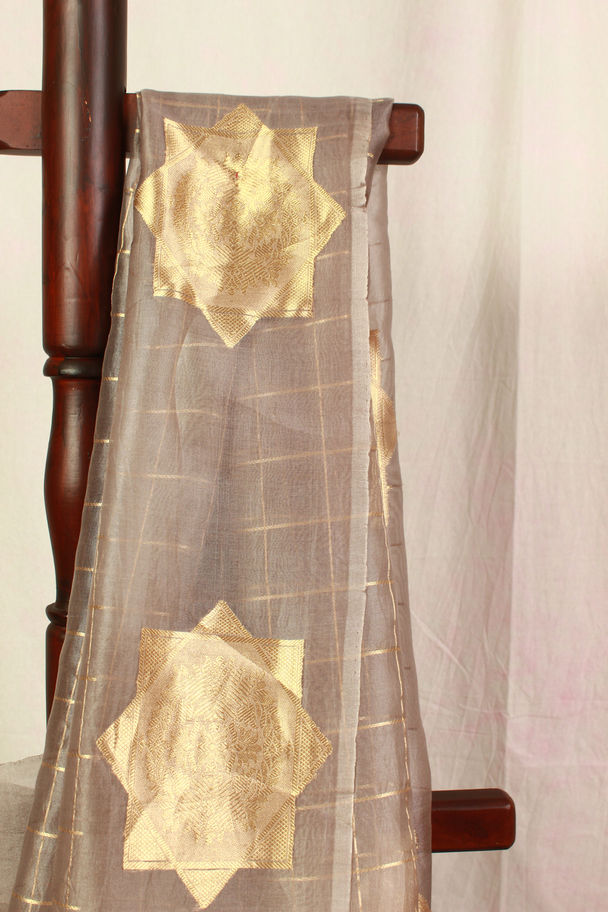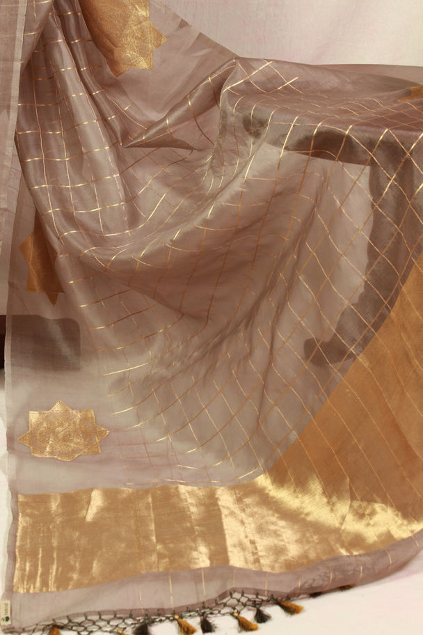 The saree features zari grid checks across the body, overlaid with intricately woven star-shaped buttas (8-pointed) in antique gold zari. These buttas are designed with a layered motif�outer points filled with fine crosshatch texture, while the inner medallion displays a floral kadhua-style weave, reminiscent of Banarasi craftsmanship. The zari used has a matte-sheen finish, lending a rich but understated look. The pallu is finished with a wide zari band in diagonal weave and a netted tassel border.