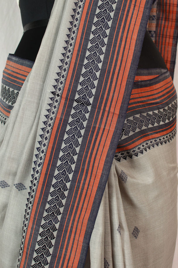 This is a handwoven cotton saree with intricate extra-weft Jamdani style motifs throughout the body and pallu. The saree features traditional motifs in black, complemented by striped borders and floral vines in the anchal. The pallu is detailed with alternating large floral bootas in burnt orange and charcoal black, balanced by and leaf motifs in the border.