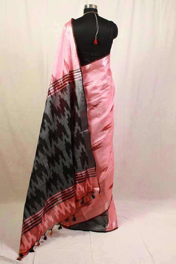 Soft watermelon pink body with deep maroon print; black and red ikkat-style pallu with striped edges and multicolored tassels.
