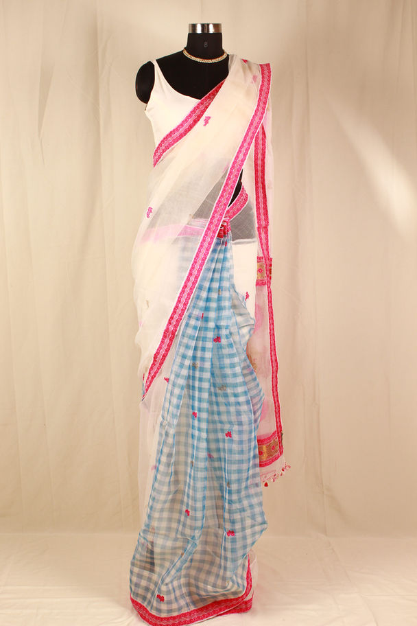 Luniyah White with Blue Checks on Arnoi Saree