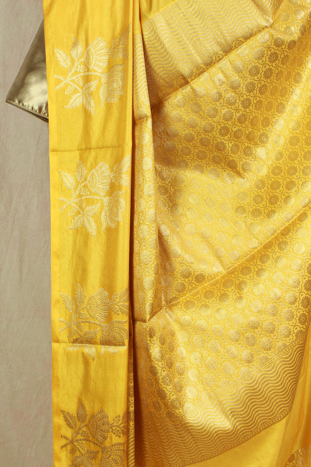 Gold zari floral motifs woven throughout the body and palla, including large rose patterns and smaller scattered florets. The work has a fine sheen, with intricate zari detailing that adds depth without overpowering the bright base. Traditional yet festive.