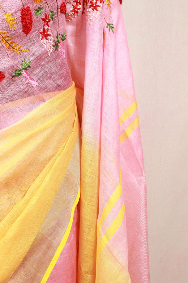 Ornikaa Pink and Yellow Linen Saree with Floral Hand Embroidery Work