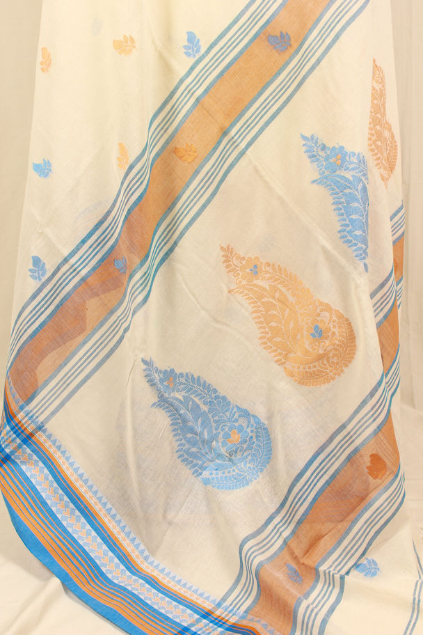 A handwoven Khadi saree adorned with delicate Jamdani motifs in pastel blue and rust tones across the body.