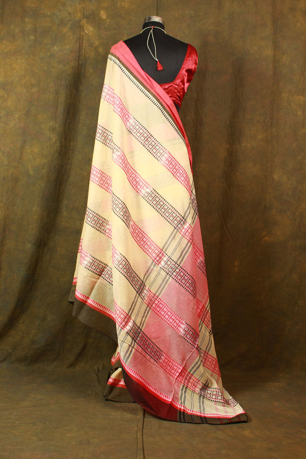 Traditional tribal-style horizontal woven bands in red and black over the pleats and palla. Palla also features layered color blocking.