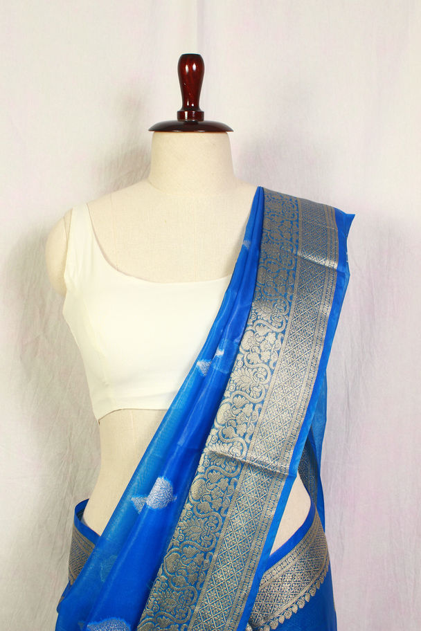 Thurelia Royal Blue Organza Saree with Gold and Silver Zari Work
