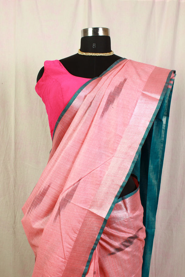 Soft peach pink body with deep teal blue pallu and border, featuring subtle maroon-black motifs.